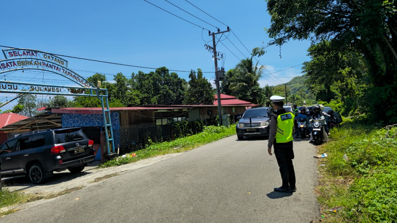 Salah satu destinasi yang menjadi fokus utama kegiatan pengamanan adalah Pantai Tapandullu Malawwa. Hari ini, Selasa (24/3/26) personel Ditlantas terlihat sangat proaktif mengatur arus kendaraan yang keluar masuk area wisata, mencegah kemacetan dan memastikan akses jalannya lancar.