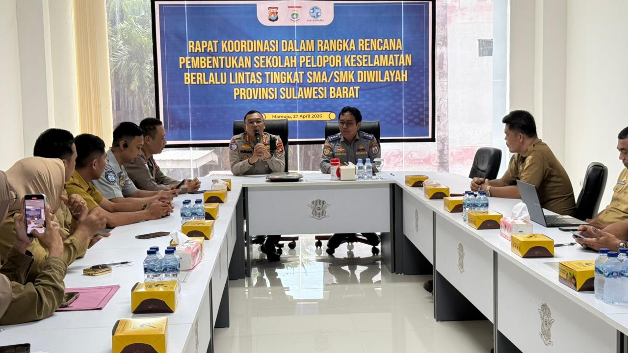 Pertemuan ini bertujuan membentuk program Sekolah Pelopor Keselamatan Berlalu Lintas khusus bagi siswa tingkat SMA/SMK yang dilaksanakan di Ruang Rapat Lantai 3 Gedung BPKB Ditlantas Polda Sulbar, Senin (27/4/26).